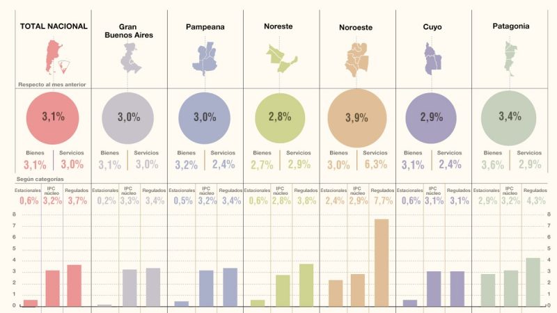 En tanto, el rubro alimentos y bebidas no alcohólicas tuvo una suba de 2,4%, por debajo del promedio.