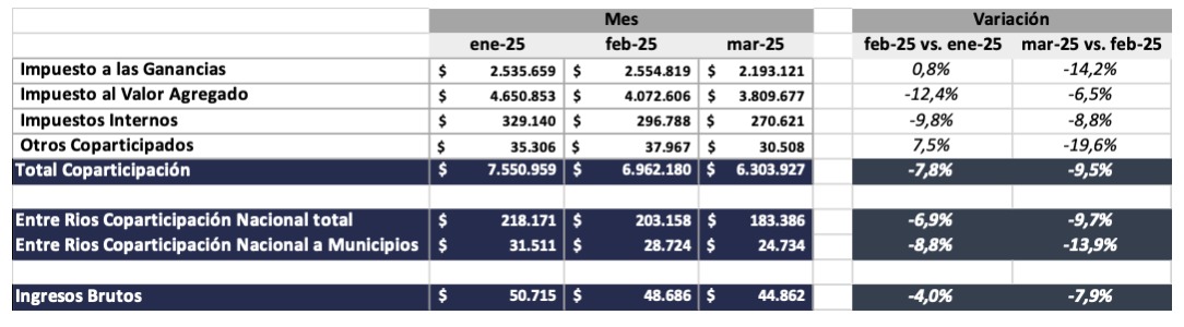La coparticipación a Entre Ríos pasó de $218.171 millones en enero-25 a $203.158 millones en febrero del mismo año. Una caída del -6,9%.