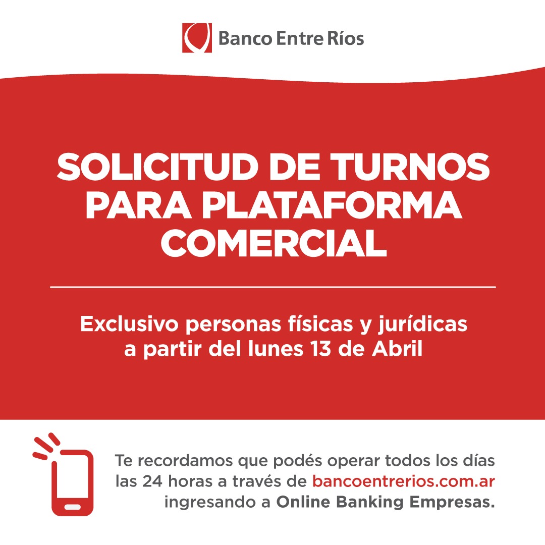 Los clientes deberán solicitar un turno previamente en la página web del Banco Entre Ríos (www.bancoentrerios.com.ar/mis-turnos-web) y recibirán un comprobante con el día de la cita, identificación de la persona (nombre completo y número de identificación) y ubicación de la sucursal a la que deberá dirigirse.