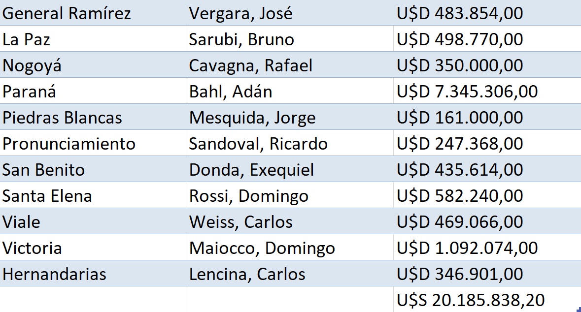 Santa Elena se comprometió por U$D 582.240,00. La ciudad de las costa del Paraná estaba gobernada por Silvio Moreyra (PJ) y volvió a manos de Domingo Daniel Rossi (peronista que fue por un espacio vecinalista).