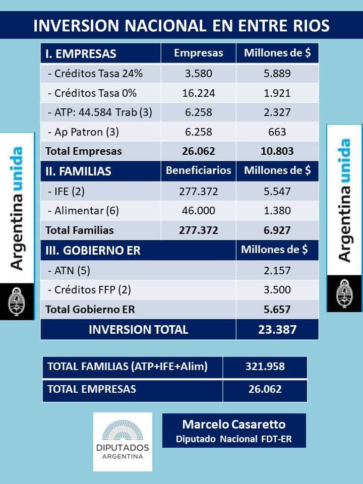Es en este contexto que la Administración Fernández invierte $ 23.387 millones en Entre Ríos. El dato fu difundido por el diputado nacional Marcelo Casaretto (Frente de Todos).